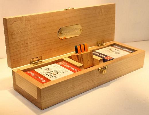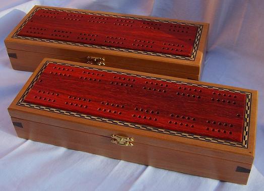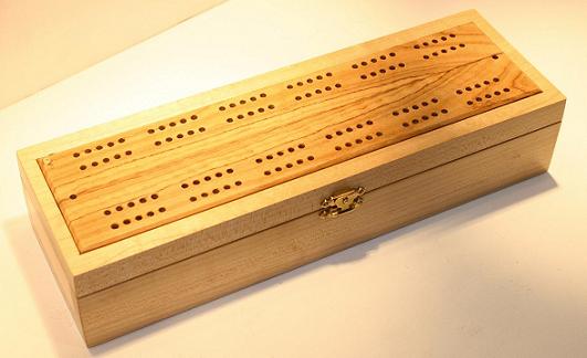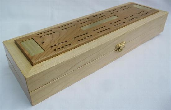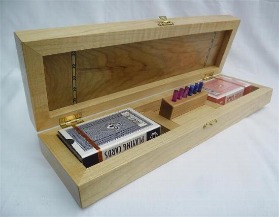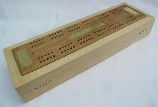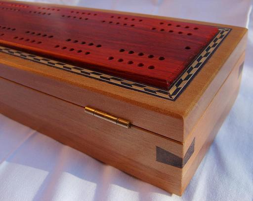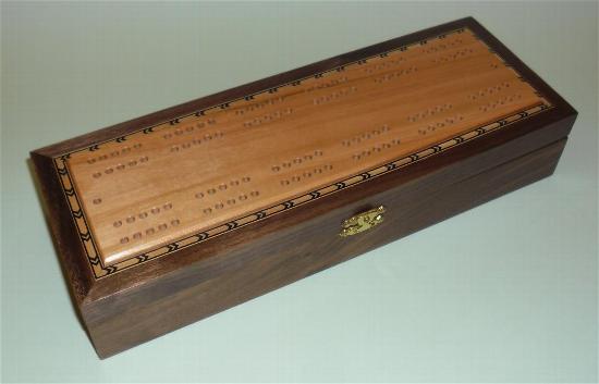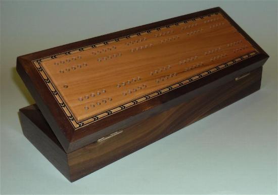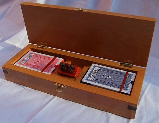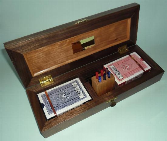 Generally speaking, the body is made from one wood and the playing surface on top is made from a contrasting wood. Inside is storage for 2 packs of playing cards together with the specially made scoring pegs. More details about the scoring pegs are available on the accessories page above. The scoring pegs are made from brass and acrylic and are stored in a rotating housing preventing them from falling out during storage or transit. Dimensions are approximately 285mm x 100mm x 50mm.